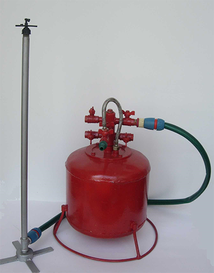 Переставной вариант КИМД-0,1П может исполняться на основе комплектов КИМД-0,1А, Б и о.г. посредством придачи им как дополнительного оборудования по одному дождевальному аппарату типа «Роса 1», «Фрегат 1» и удлиненного подводящего шланга. В этом случае гидроаккумулятор используется без оросительной сети. Краны закрываются, на переходнике вместо верхней заглушки ставиться дождевальный аппарат. Комплекты КИМД-0,1 не имеют принципиальных конструктивных отличий. Комплект оборудования импульсного микродождевания КИМД-0,1 состоит из следующих основных узлов: узла водоподачи, гидроаккумулятора 1 с распределительной арматурой, поливной сети. Узел водоподачи включает: штуцер, входящий кран, фильтр, счетчик воды, тройник с пробкой для подключения дополнительного оборудования, например, растворного узла, манометр, муфту переходную, подводящий трубопровод. Гидроаккумулятор с распределительной арматурой включает: гидроаккумулятор, разделённый шаровой эластичной диафрагмой на водную и воздушную полости. Воздушная полость имеет клапан для закачки воздуха, а водная полость оснащена запорным органом автоколебательного действия и штуцером для подсоединения водопроводящего трубопровода. На штуцере запорного органа расположен переходник, на котором размещены два переключающихся крана, угольник для соединения шланга, тройник для отбора воды на импульсный режим работы, четыре выходных крана с угольниками для подключения распределительных трубопроводов. Поливная сеть включает: распределительные (четыре) трубопровода 2, с заглушками на концах и ниппелями, соединительные трубопроводы 3, дождевальные аппараты с переходниками и стояками 4. Основным элементом системы импульсного микродождевания с комплектом КИМД-0,1, определяющим особенности её технологии орошения, является гидропневмоаккумулятор 1, воздушная полость которого заполнена воздухом под давлением 0,15 МПа. КИМД-0,1 может работать в двух режимах дождевания: импульсном и непрерывном. Новизна комплекта подтверждена авторскими свидетельствами № 1806556, № 1794410, № 1606024 и патентом на изобретение № 2087095. |