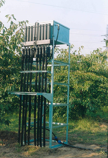 Краткое описаниеМодуль импульсно-локального орошения садов МИЛОС-М предназначен для непрерывного орошения садов, виноградников и ягодных кустарников на площади до 0,4 га, с импульсной подачей воды мелкими струйками локально в прикорневую зону в соответствии с суточным ходом водопотребления растений. Комплект импульсно-локального орошения является модулем для построения стационарных систем орошения на участках с уклонами до 0,005. Модуль включает: подводящий трубопровод 1, питающую трубку 2, накопительную ёмкость 3, установленную с командным уровнем над полем; распределительное устройство 4, для автоматической поочередной подачи воды из ёмкости в приёмные трубы 5; распределительные трубопроводы 6; поливные трубопроводы с микроводовыпусками 7, а также может дополнительно оснащаться стабилизатором расхода воды 8 и растворным узлом для ввода питательных смесей в поливную воду. Накопительная ёмкость представляет собой бак с крышкой. Бак имеет патрубки для ввода и слива воды и отверстие для соединения с распределительным устройством. Распределительное устройство включает: заряжающий сифон, устройство запуска заряжающего сифона, устройство срыва вакуума в заряжающем сифоне, коллектор, рабочие сифоны, переключающие трубки. Распределительные трубопроводы выполнены из полиэтиленовых труб диаметром 40 мм и обеспечивают подачу воды в подсоединенные к ним поливные трубопроводы. Поливные трубопроводы изготовлены из полиэтиленовых труб диаметром 25...32 мм с выполненными в их стенках микроводовыпусками Ø 1,5...3,0 мм, ориентированными по поливному трубопроводу с обеспечением гашения вытекающих из них струек непосредственно на поливном трубопроводе и, в зависимости от модификации могут быть 25 или 50 м длиной. Полив производится автоматически в циклическом режиме по секциям поливного участка с интенсивностью водоподачи, близкой к водопотреблению культуры. Принцип работы модуля системы заключается в периодическом непрерывном накоплении малым расходом (до капельного) объёма воды или питательного раствора в аккумулирующей ёмкости с последующей подачей его большим расходом в одну из секций поливной сети. Накапливаемый объём воды последовательно, в циклическом режиме, автоматически подаётся на поливные секции, чередуя кратковременный выплеск с продолжительной паузой. Импульсная водоподача с очень малой интенсивностью, близкой к водопотреблению растений, создает наиболее благоприятный для растений водный режим орошаемого поля. Способ аккумулирования малых расходов позволит снизить энергозатраты на водоподачу в 5-6 раз. Система способна работать при подводимых напорах в 2,5-4 м. Узел водооборота системы не требует дополнительных энергозатрат, так как не имеет ни одной движущейся детали. Источником водоснабжения системы могут быть: открытые водоисточники с использованием электробытовых насосов напорный трубопровод существующей или специально построенной оросительной сети. Новизна подтверждена патентами РФ № 2108548, № 2127833, № 2183821, № 2216031. |