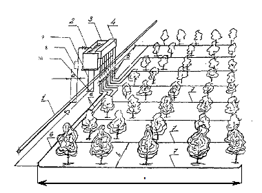 1-подводящий трубопровод; 2- питающая труба; 3-накопительная емкость; 4-механизм импульсного водораспределения с водовыпусками; 5-приемные трубы; 6-рапределительные трубопроводы; 7- поливные трубопроводы; 8-стабилизатор расхода; 9-опора головного распределительного узла; 10-опорная плита. |