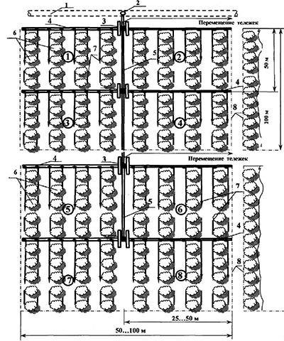 1 — оросительный трубопровод; 2 — гидрант; 3 — унифицированные тележки ППК-25; 4 — поливной шлейф с водовыпусками; 5 — водопроводящий гибкий трубопровод; 6 — ряды насаждений; 7 — поливные борозды и направление полива; 8 — граница поливной карты.
