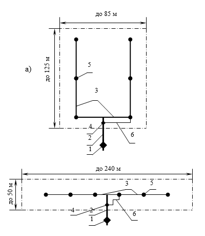 Принципиальные схемы трубопроводной сети КСИД-1: а), б) — варианты размещения (привязки) поливной сети.